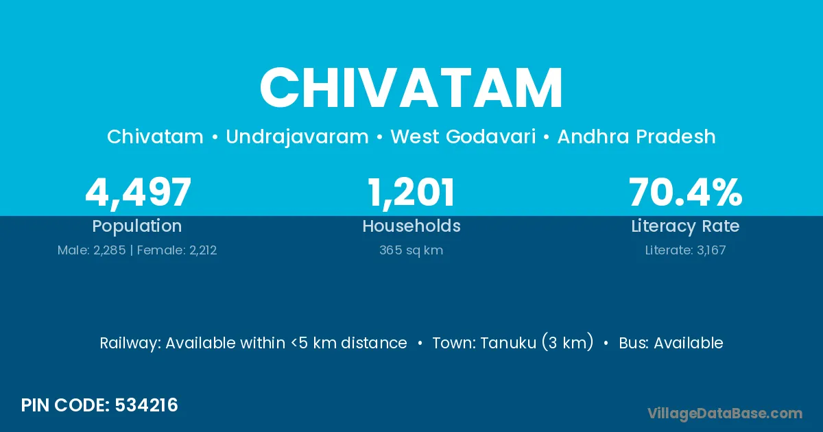 Tanuku (3 km) is the nearest town to Chivatam village for major economic activities and is located approximately 3 km away.