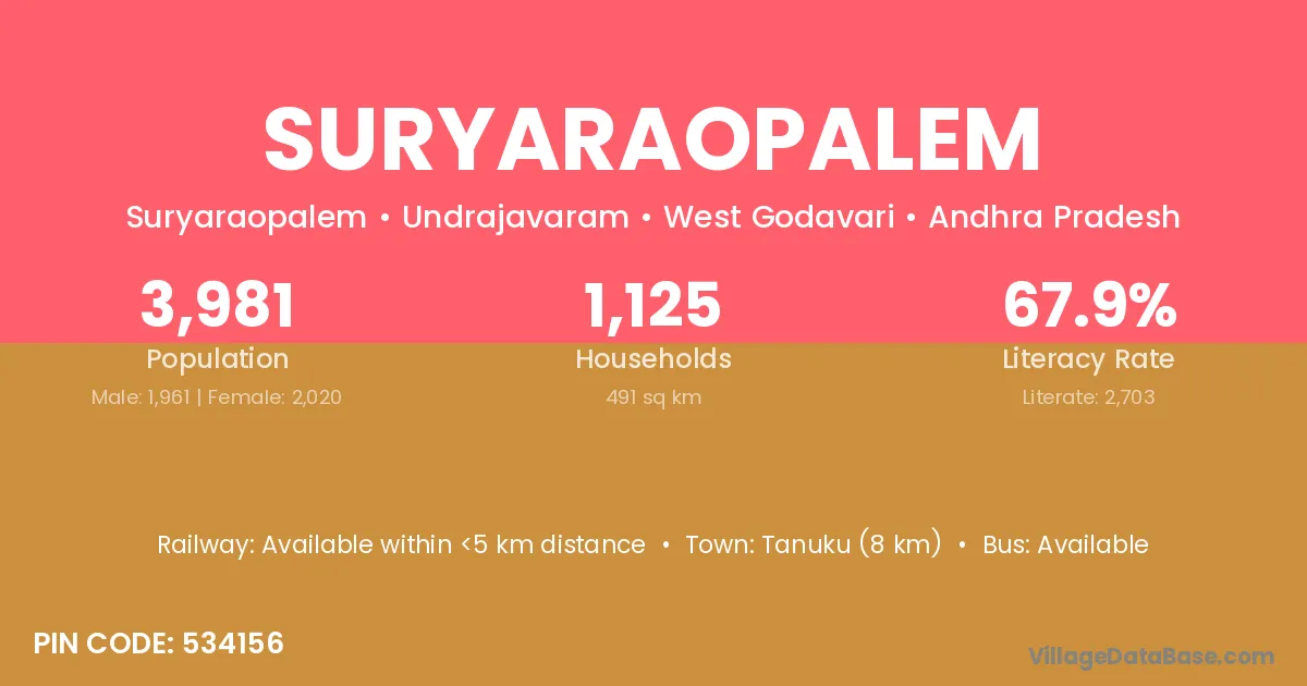 Suryaraopalem village has a total population of 3,981 people, of which 1,961 are males and 2,020 are females.