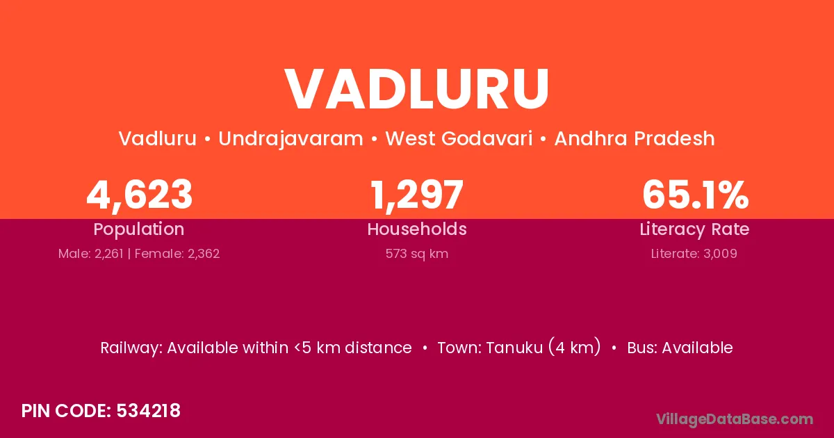 Tanuku (4 km) is the nearest town to Vadluru village for major economic activities and is located approximately 4 km away.