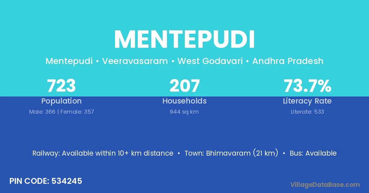 Bhimavaram (21 km) is the nearest town to Mentepudi village for major economic activities and is located approximately 21 km away.