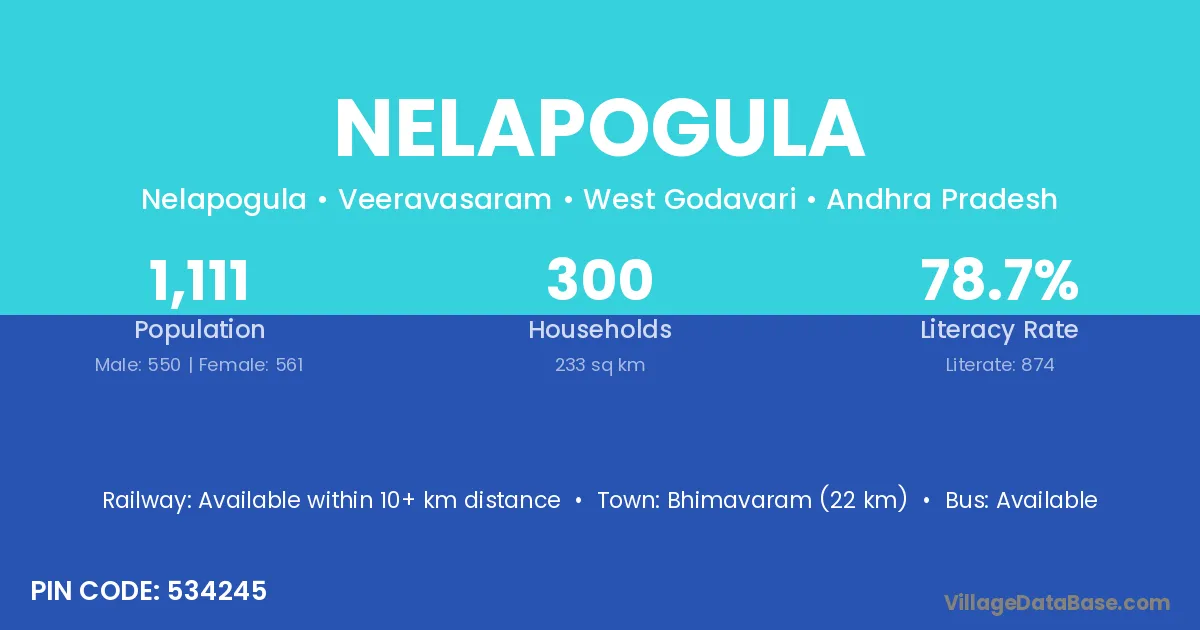 Bhimavaram (22 km) is the nearest town to Nelapogula village for major economic activities and is located approximately 22 km away.