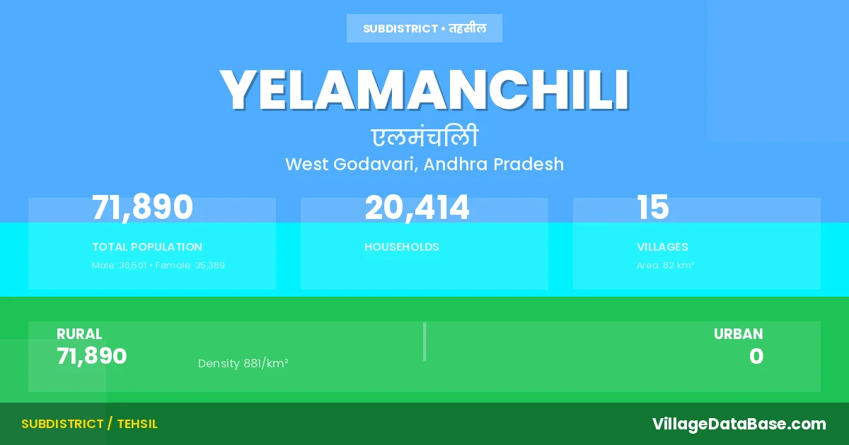 According to the 2011 census The total area of Yelamanchili Mandal is 82 km², with a population of 71890 people. The population density is 881 inhabitants per square kilometre, and there are approximately 20414 houses in the sub district.