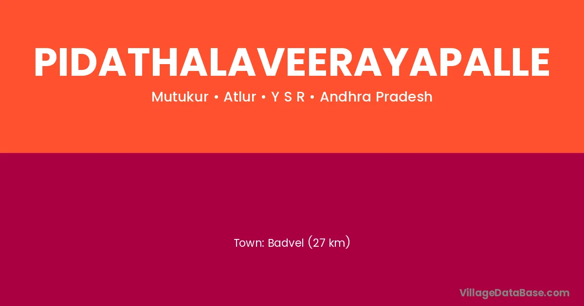 Badvel (27 km) is the nearest town to Pidathalaveerayapalle village for major economic activities and is located approximately 27 km away.
