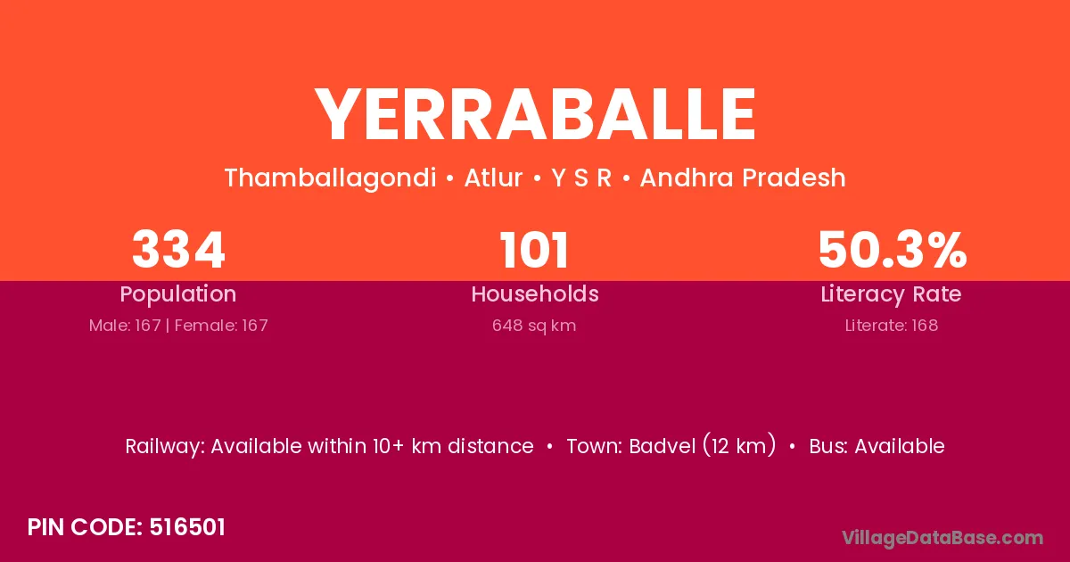 Badvel (12 km) is the nearest town to Yerraballe village for major economic activities and is located approximately 12 km away.
