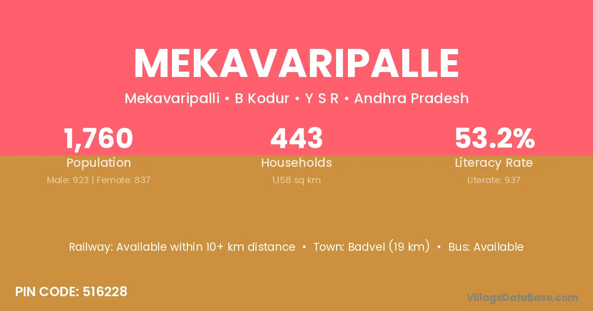 Badvel (19 km) is the nearest town to Mekavaripalle village for major economic activities and is located approximately 19 km away.