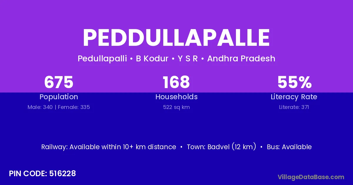 Badvel (12 km) is the nearest town to Peddullapalle village for major economic activities and is located approximately 12 km away.