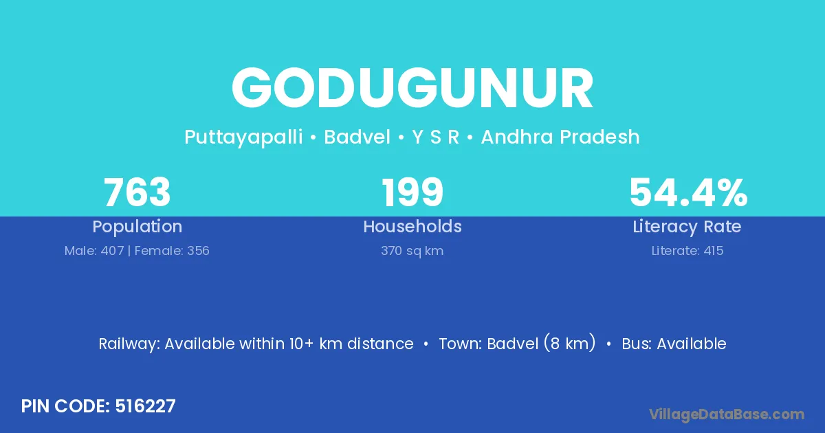 Badvel (8 km) is the nearest town to Godugunur village for major economic activities and is located approximately 8 km away.