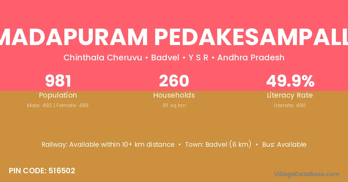 Imadapuram Pedakesampalle village has a total population of 981 people, of which 492 are males and 489 are females.