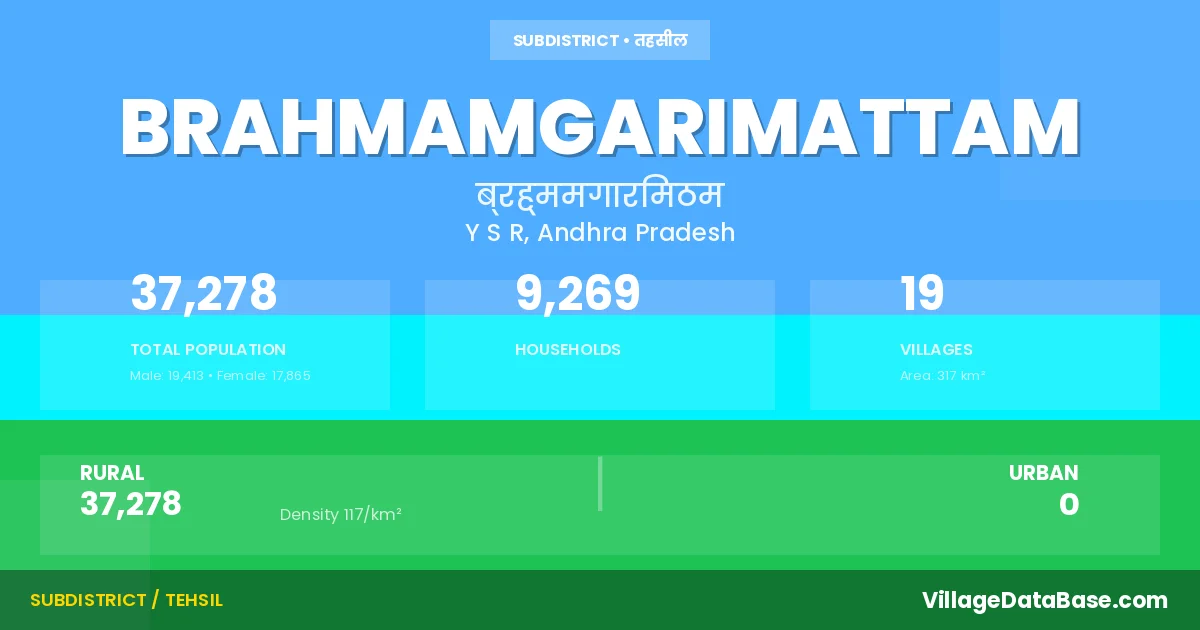 According to the 2011 census The total area of Brahmamgarimattam Mandal is 317 km², with a population of 37278 people. The population density is 117 inhabitants per square kilometre, and there are approximately 9269 houses in the sub district.
