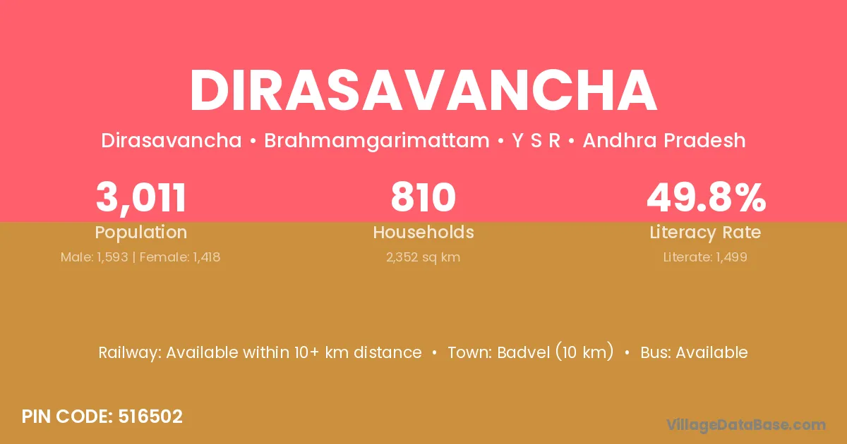 Badvel (10 km) is the nearest town to Dirasavancha village for major economic activities and is located approximately 10 km away.