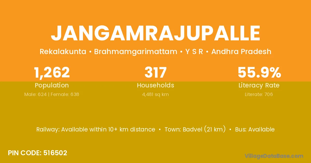 Badvel (21 km) is the nearest town to Jangamrajupalle village for major economic activities and is located approximately 21 km away.