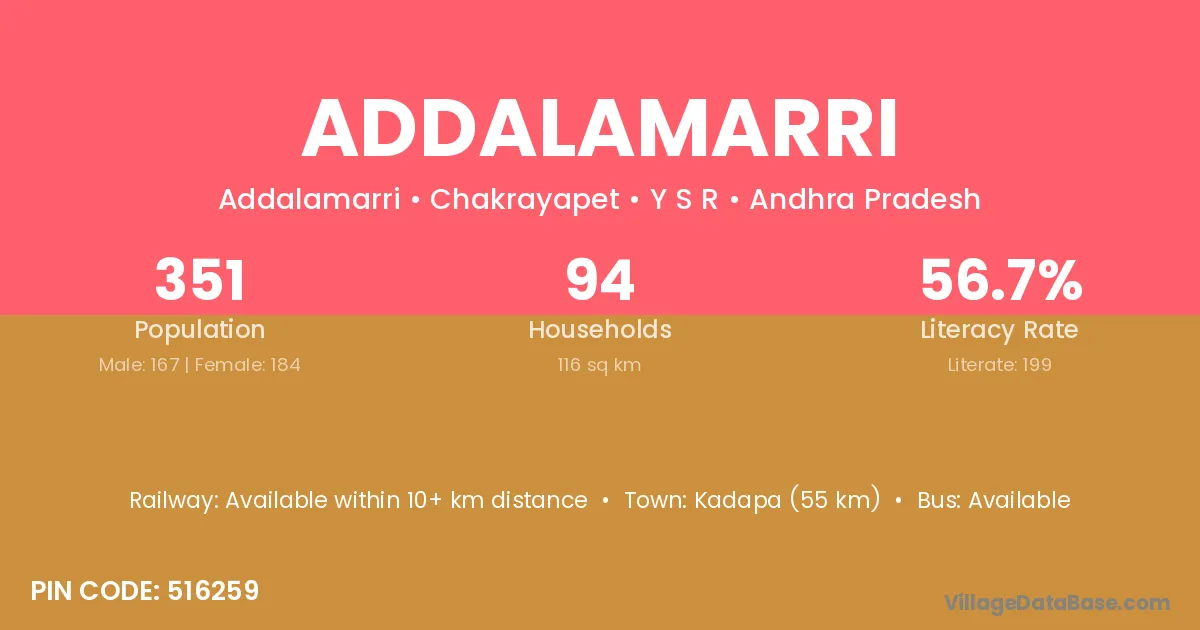 Kadapa (55 km) is the nearest town to Addalamarri village for major economic activities and is located approximately 55 km away.