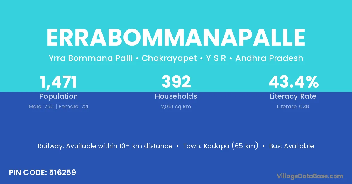Kadapa (65 km) is the nearest town to Errabommanapalle village for major economic activities and is located approximately 65 km away.