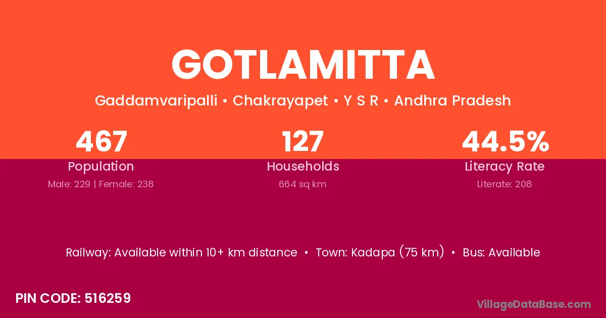 Gotlamitta village has a total population of 467 people, of which 229 are males and 238 are females.