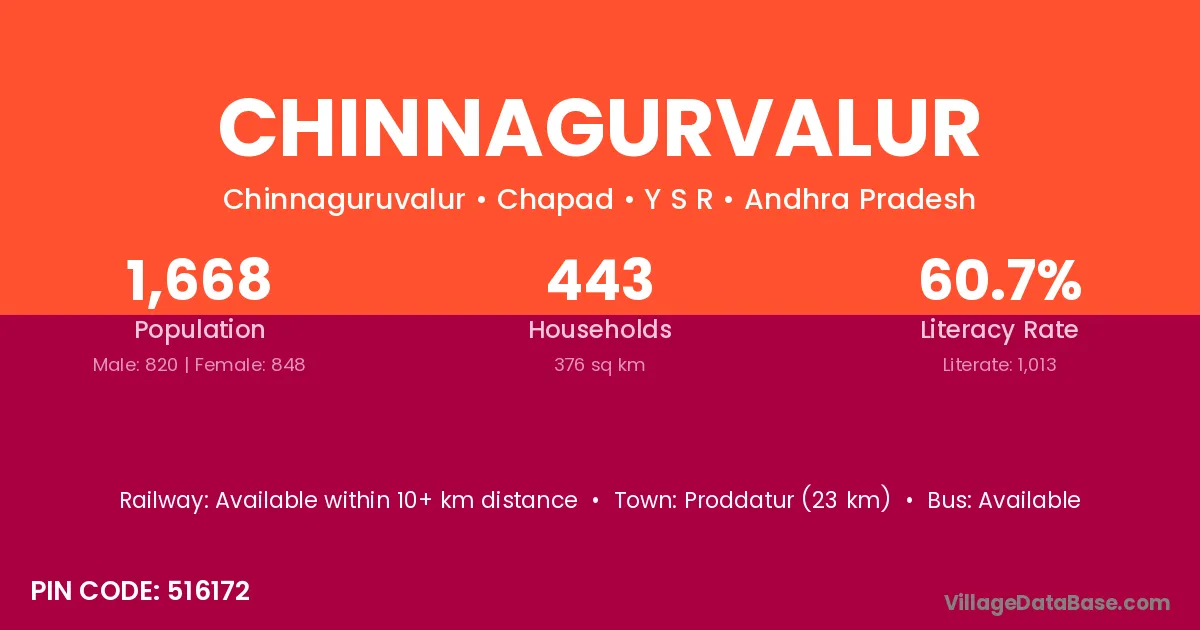Proddatur (23 km) is the nearest town to Chinnagurvalur village for major economic activities and is located approximately 23 km away.