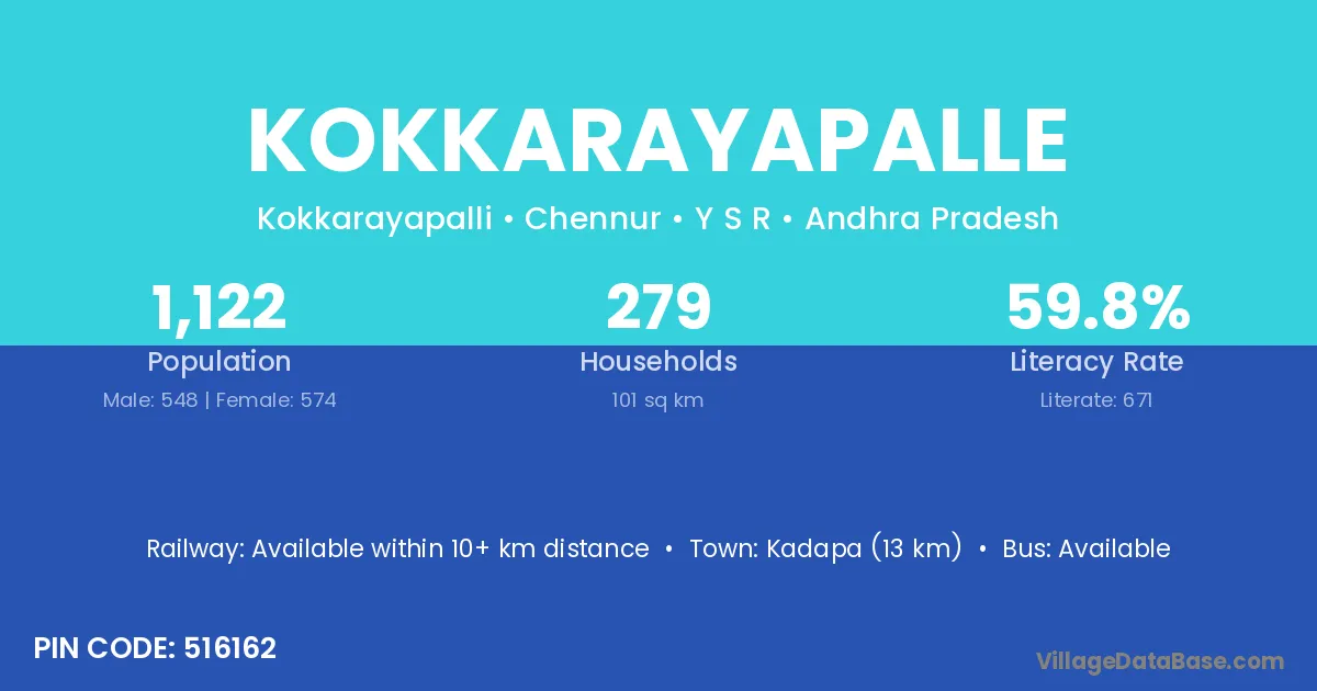 Kadapa (13 km) is the nearest town to Kokkarayapalle village for major economic activities and is located approximately 13 km away.