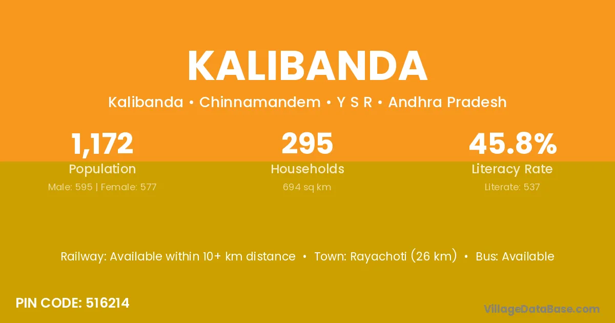 Rayachoti (26 km) is the nearest town to Kalibanda village for major economic activities and is located approximately 26 km away.