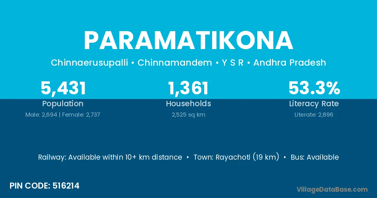 Rayachoti (19 km) is the nearest town to Paramatikona village for major economic activities and is located approximately 19 km away.