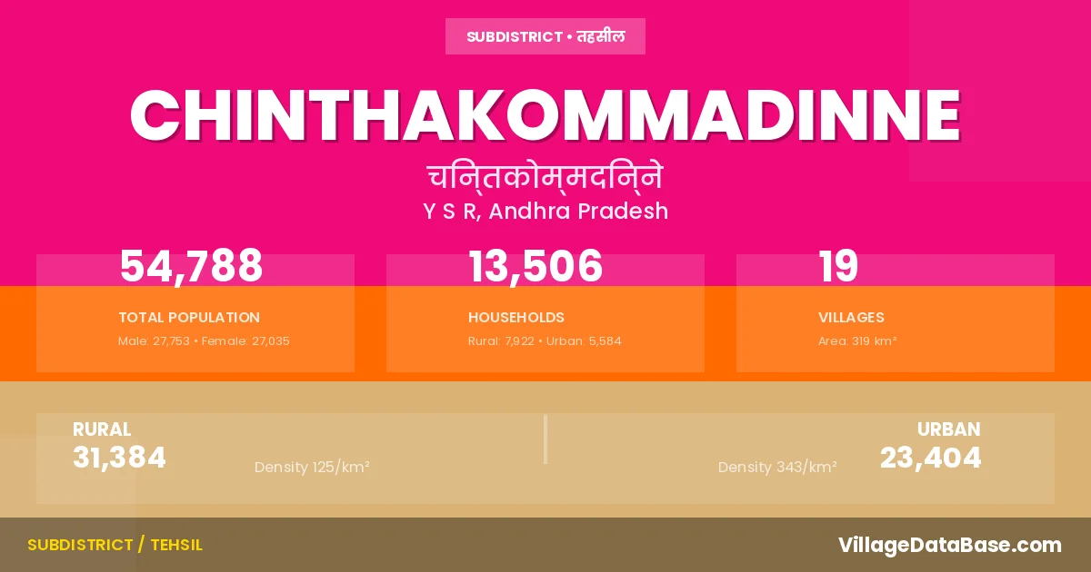 According to the 2011 census The total area of Chinthakommadinne Mandal is 319 km², with a population of 54788 people. The population density is 172 inhabitants per square kilometre, and there are approximately 13506 houses in the sub district.