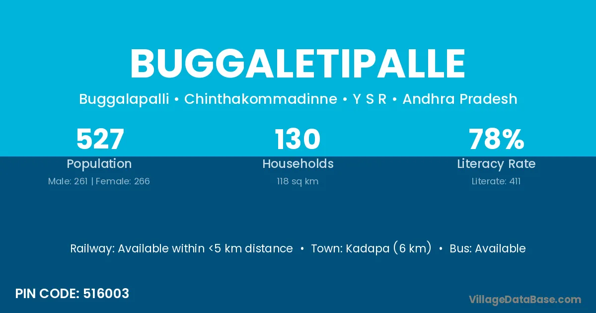 Kadapa (6 km) is the nearest town to Buggaletipalle village for major economic activities and is located approximately 6 km away.