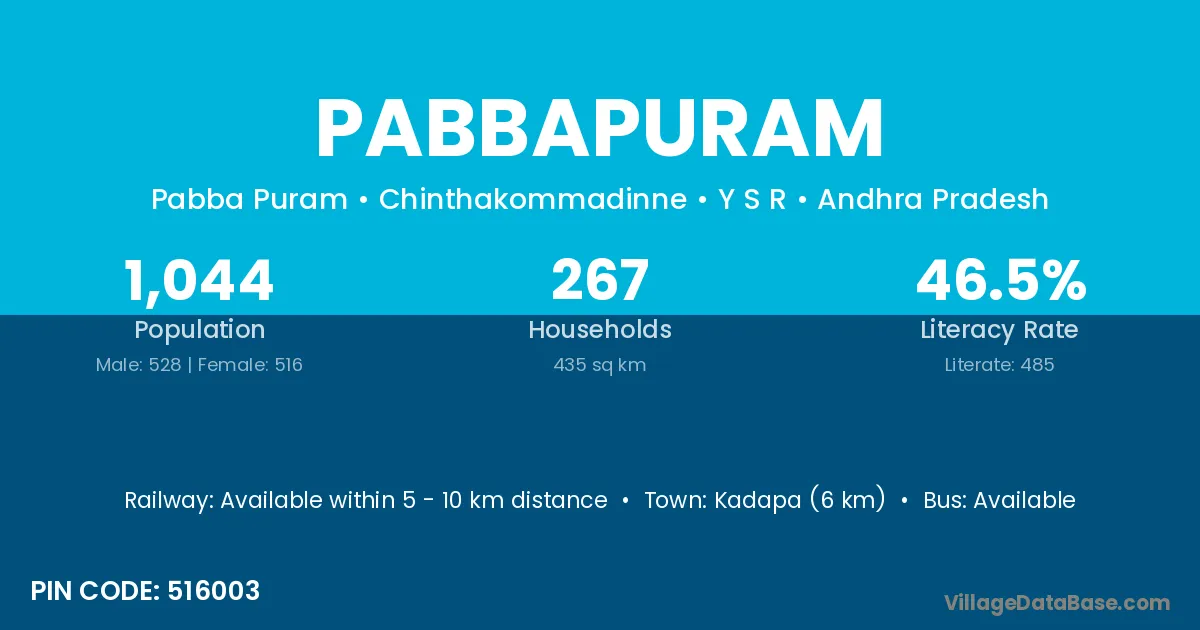 Kadapa (6 km) is the nearest town to Pabbapuram village for major economic activities and is located approximately 6 km away.