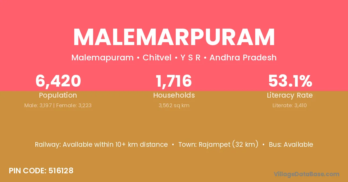 Rajampet (32 km) is the nearest town to Malemarpuram village for major economic activities and is located approximately 32 km away.