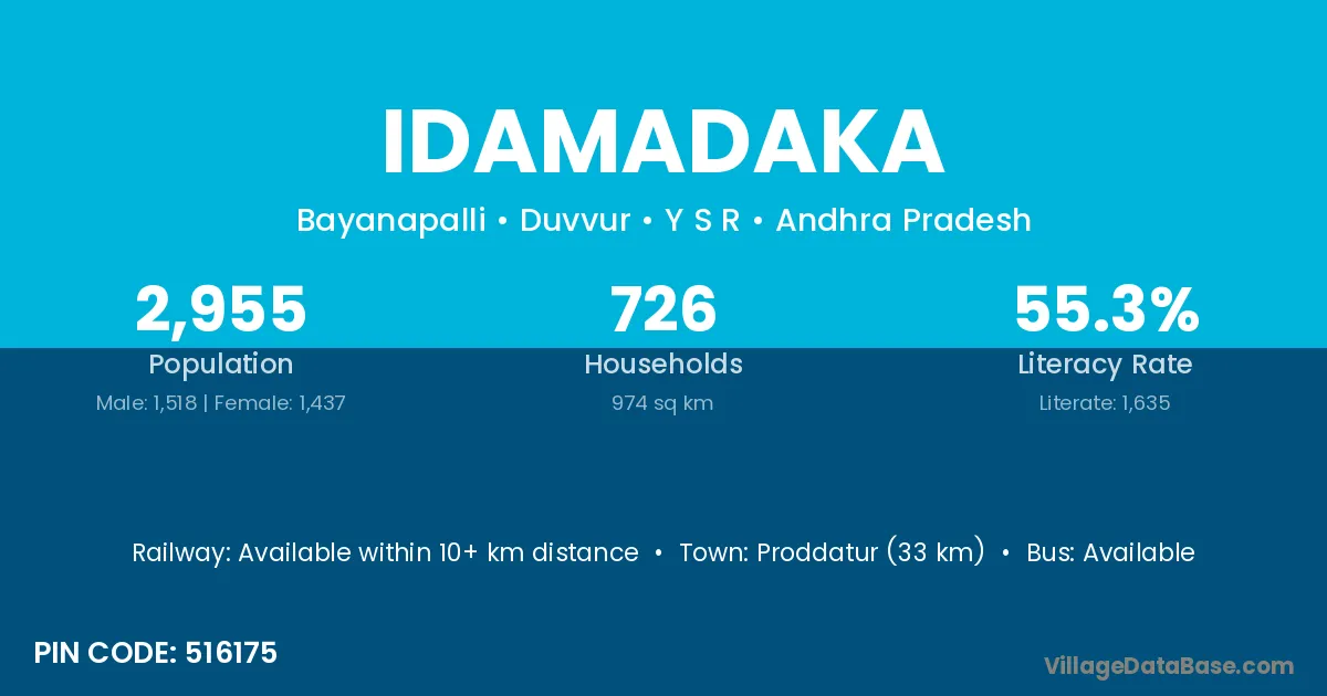 Proddatur (33 km) is the nearest town to Idamadaka village for major economic activities and is located approximately 33 km away.
