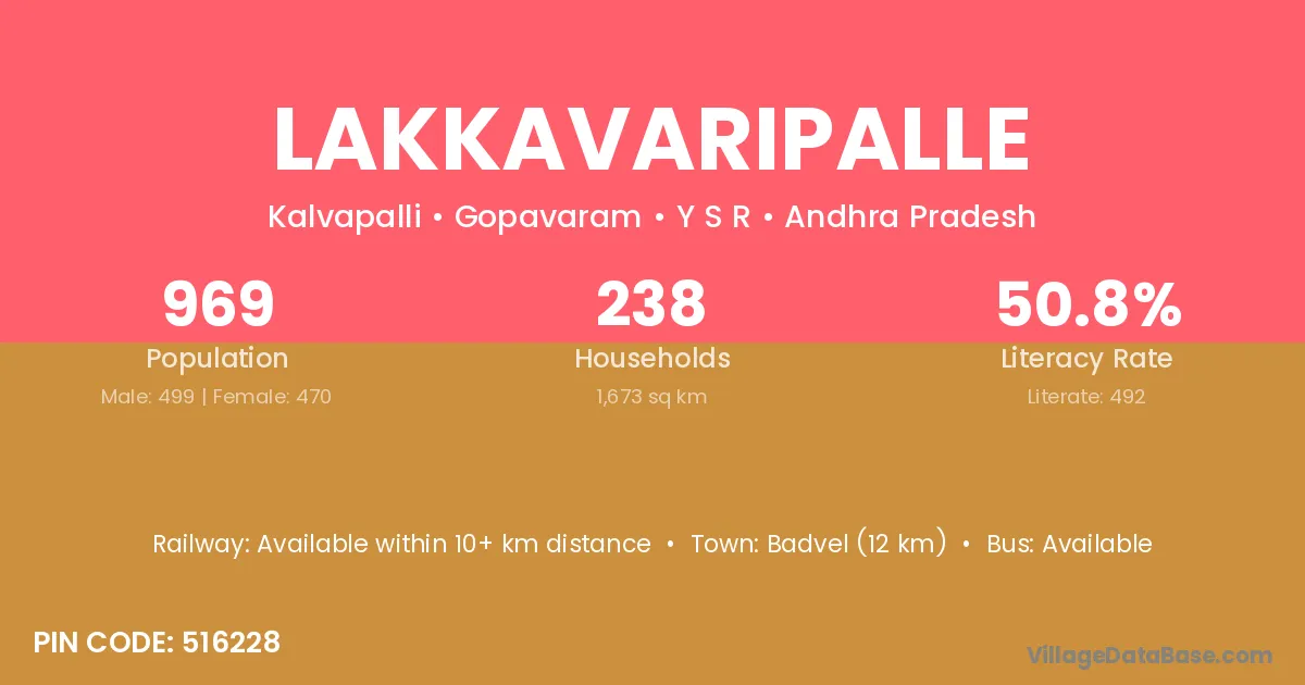 Badvel (12 km) is the nearest town to Lakkavaripalle village for major economic activities and is located approximately 12 km away.