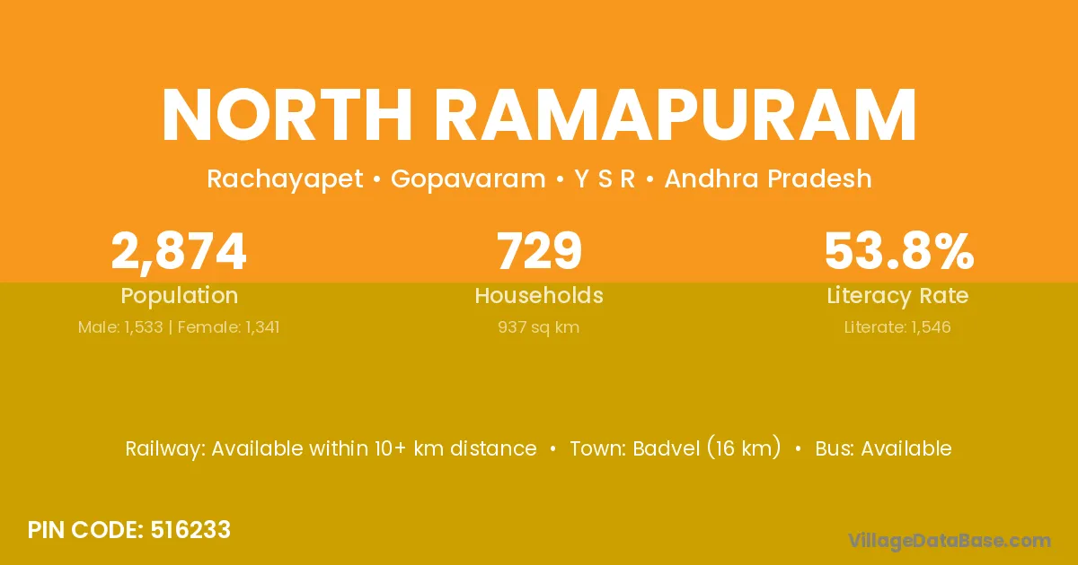 Badvel (16 km) is the nearest town to North Ramapuram village for major economic activities and is located approximately 16 km away.