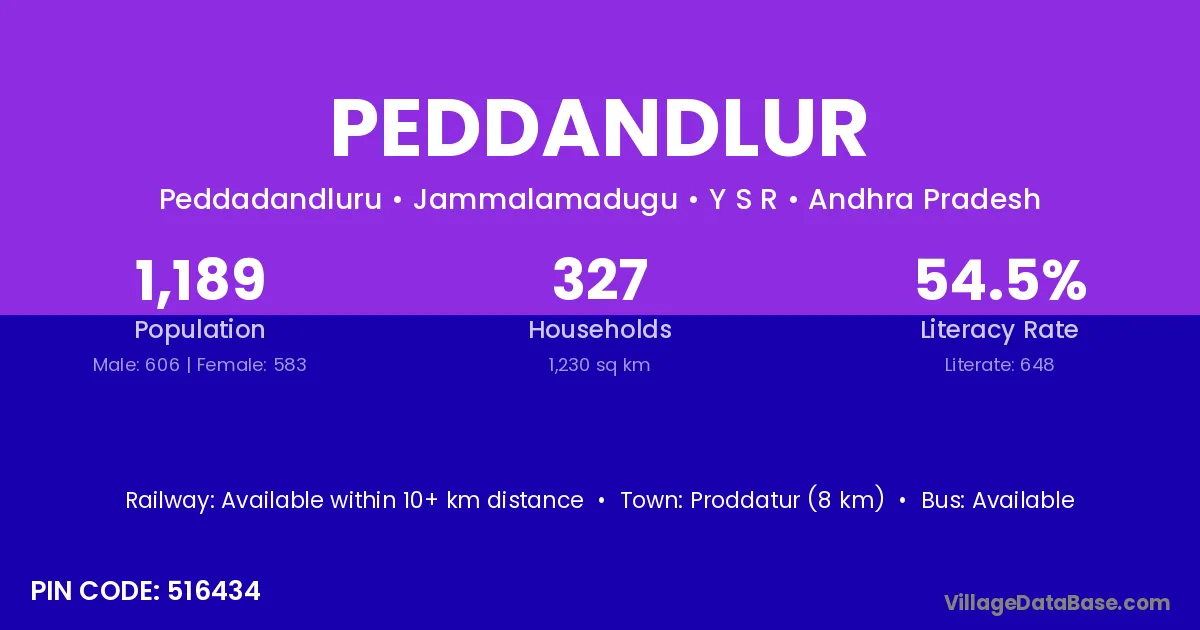Peddandlur village has a total population of 1,189 people, of which 606 are males and 583 are females.