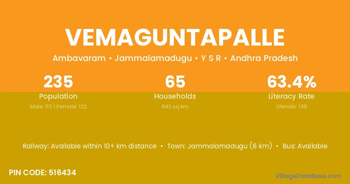 Jammalamadugu (6 km) is the nearest town to Vemaguntapalle village for major economic activities and is located approximately 6 km away.
