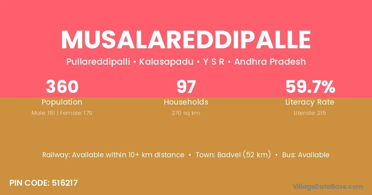 According to Census 2011 information, the village code of Musalareddipalle village is 516217.