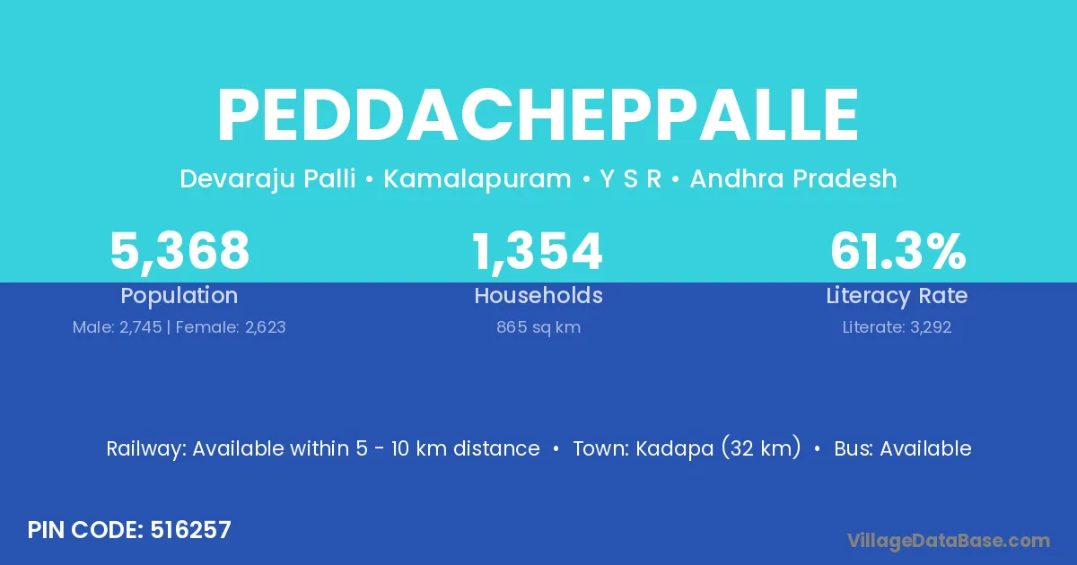 Kadapa (32 km) is the nearest town to Peddacheppalle village for major economic activities and is located approximately 32 km away.