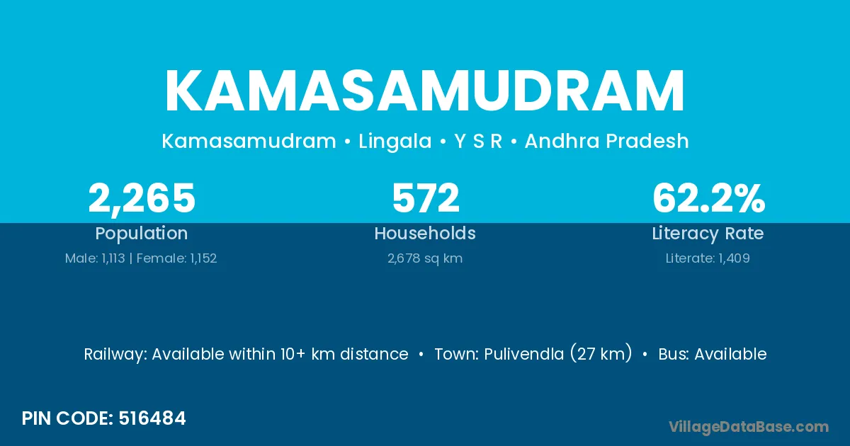 Pulivendla (27 km) is the nearest town to Kamasamudram village for major economic activities and is located approximately 27 km away.