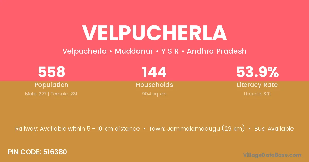 Jammalamadugu (29 km) is the nearest town to Velpucherla village for major economic activities and is located approximately 29 km away.