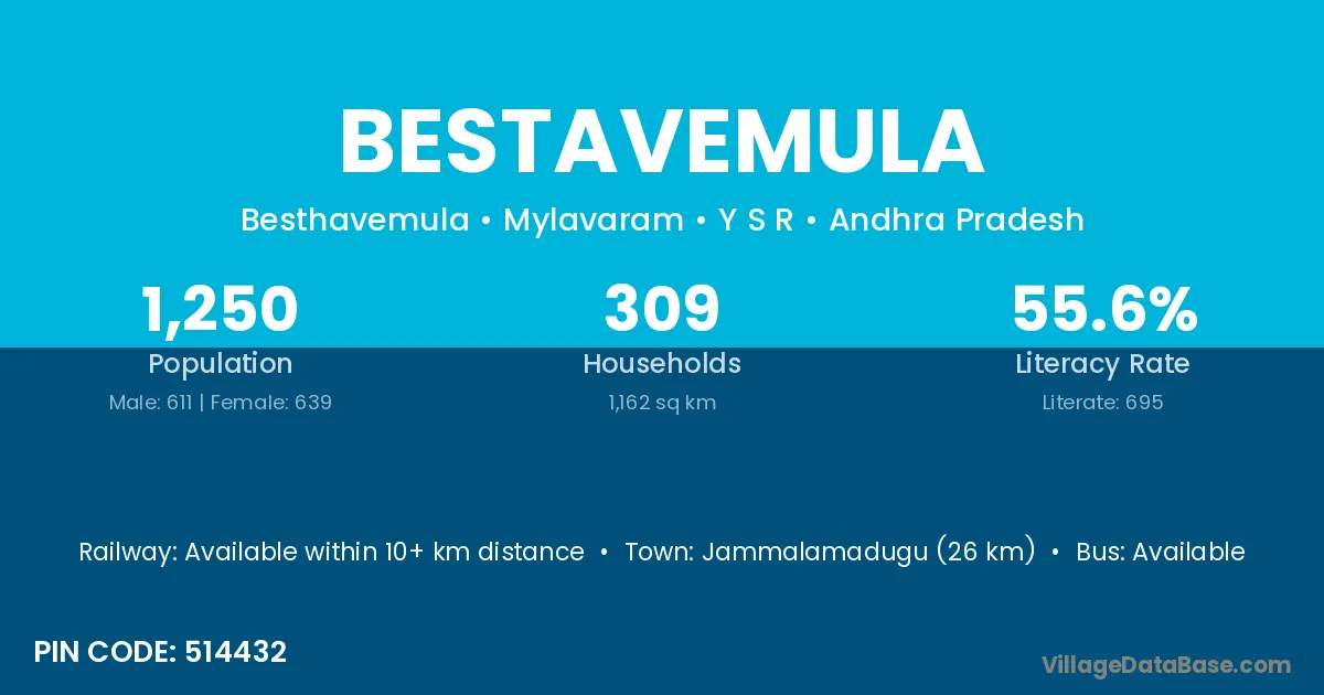 Jammalamadugu (26 km) is the nearest town to Bestavemula village for major economic activities and is located approximately 26 km away.
