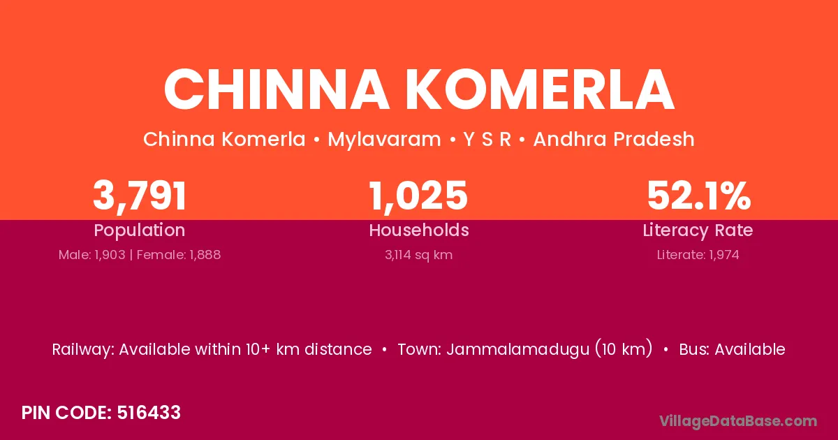 Chinna Komerla village has a total population of 3,791 people, of which 1,903 are males and 1,888 are females.