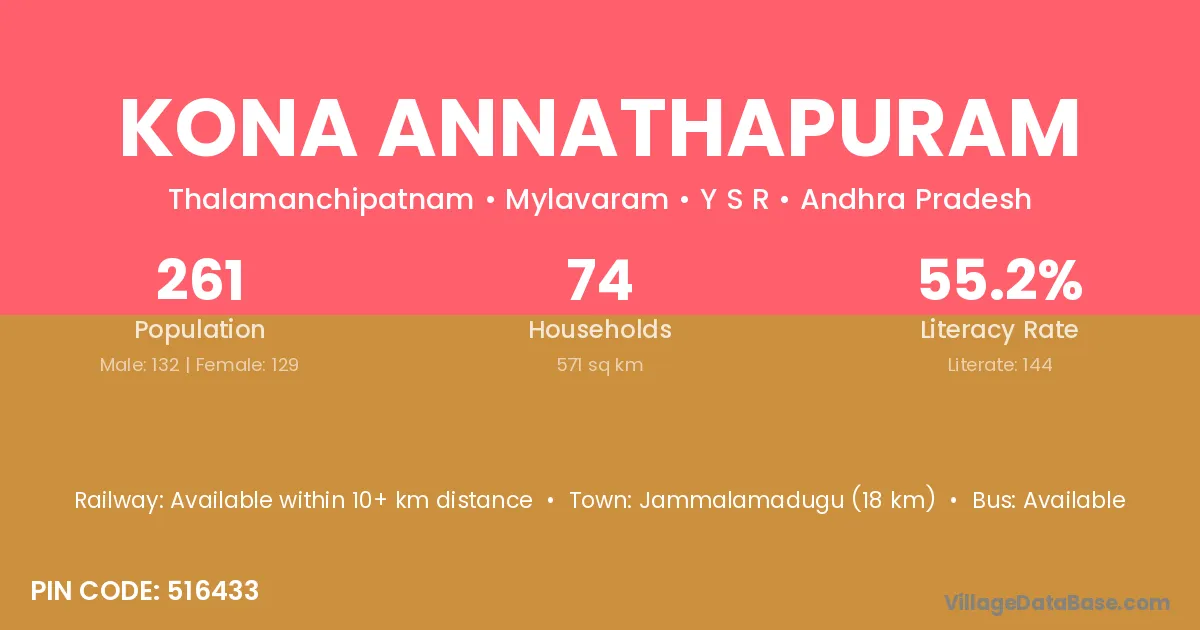 Jammalamadugu (18 km) is the nearest town to Kona Annathapuram village for major economic activities and is located approximately 18 km away.