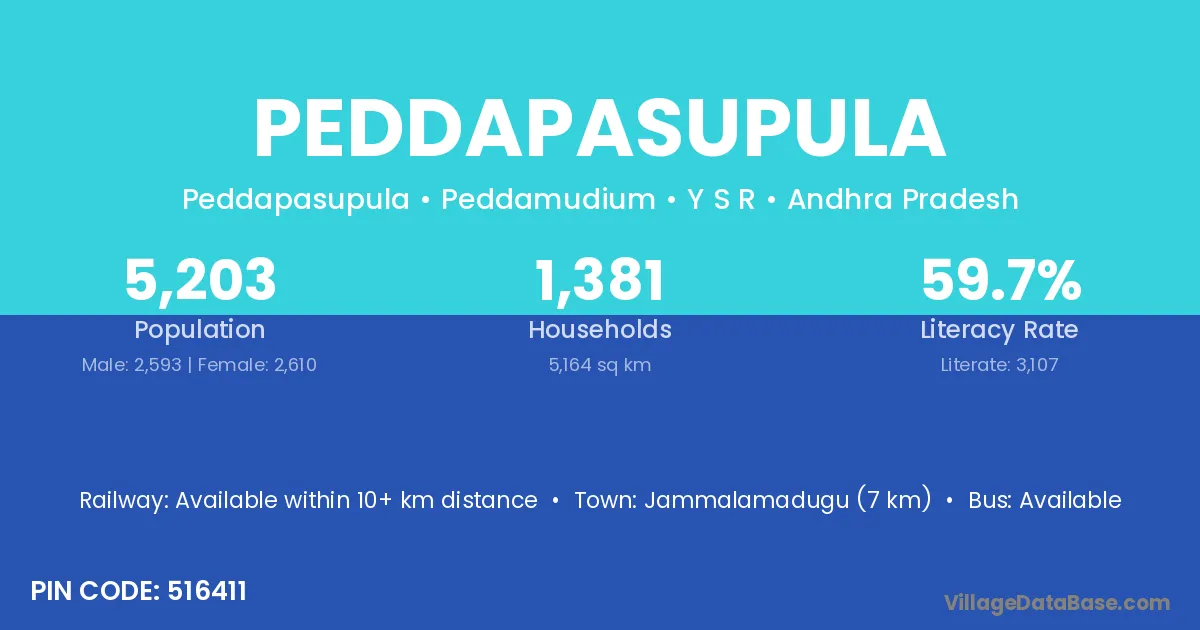 Peddapasupula village has a total population of 5,203 people, of which 2,593 are males and 2,610 are females.