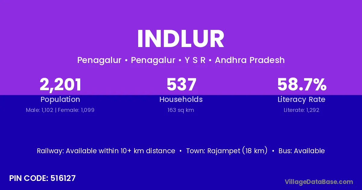 Rajampet (18 km) is the nearest town to Indlur village for major economic activities and is located approximately 18 km away.