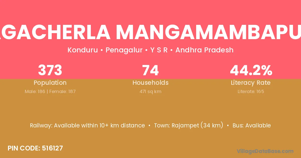 Yelagacherla Mangamambapuram village has a total population of 373 people, of which 186 are males and 187 are females.