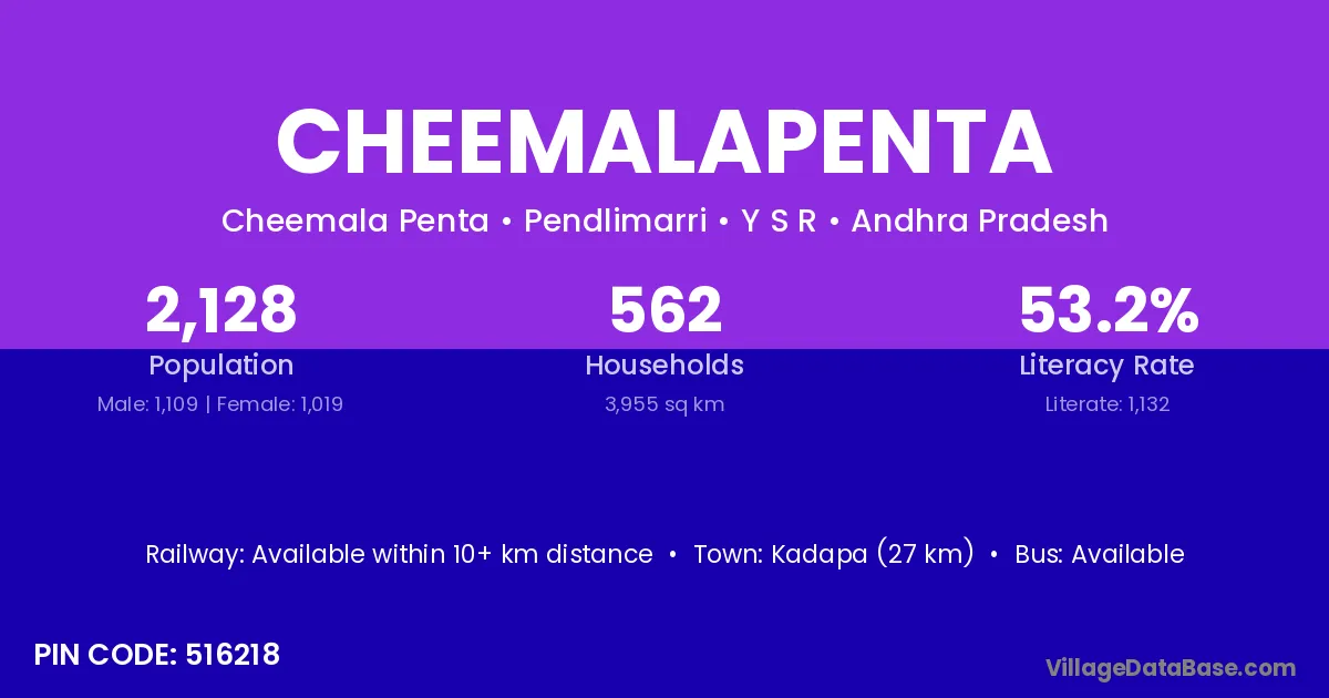 Kadapa (27 km) is the nearest town to Cheemalapenta village for major economic activities and is located approximately 27 km away.