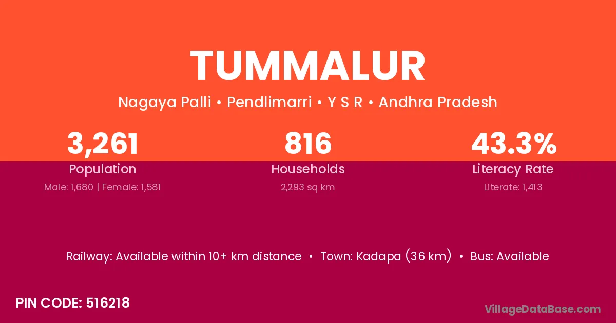 Kadapa (36 km) is the nearest town to Tummalur village for major economic activities and is located approximately 36 km away.