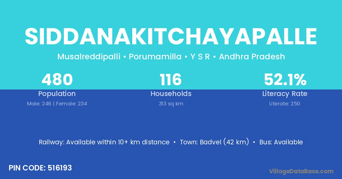 Badvel (42 km) is the nearest town to Siddanakitchayapalle village for major economic activities and is located approximately 42 km away.