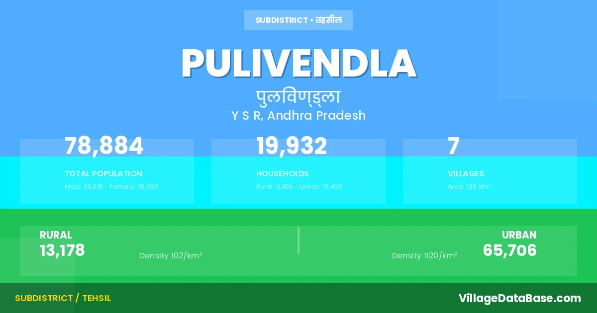 According to the 2011 census The total area of Pulivendla Mandal is 188 km², with a population of 78884 people. The population density is 420 inhabitants per square kilometre, and there are approximately 19932 houses in the sub district.