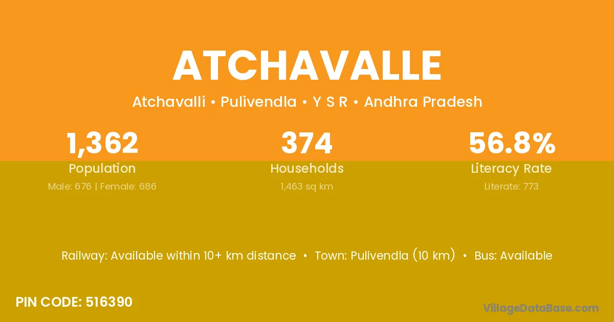 Pulivendla (10 km) is the nearest town to Atchavalle village for major economic activities and is located approximately 10 km away.