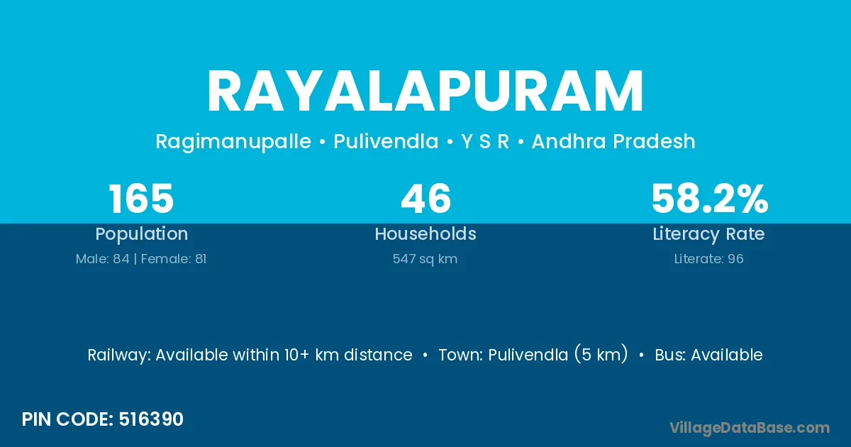Pulivendla (5 km) is the nearest town to Rayalapuram village for major economic activities and is located approximately 5 km away.