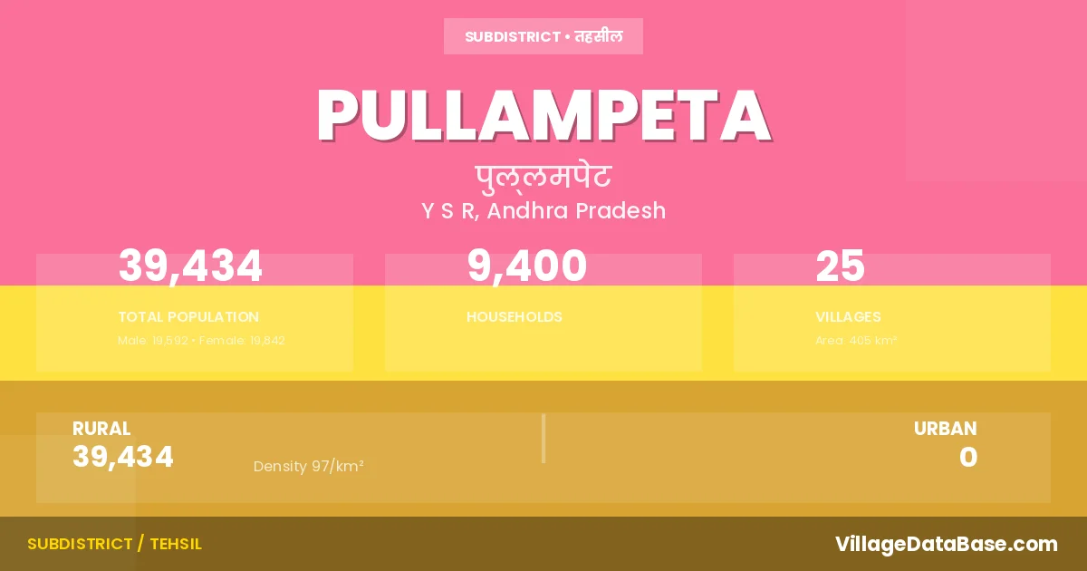 According to the 2011 census The total area of Pullampeta Mandal is 405 km², with a population of 39434 people. The population density is 97 inhabitants per square kilometre, and there are approximately 9400 houses in the sub district.
