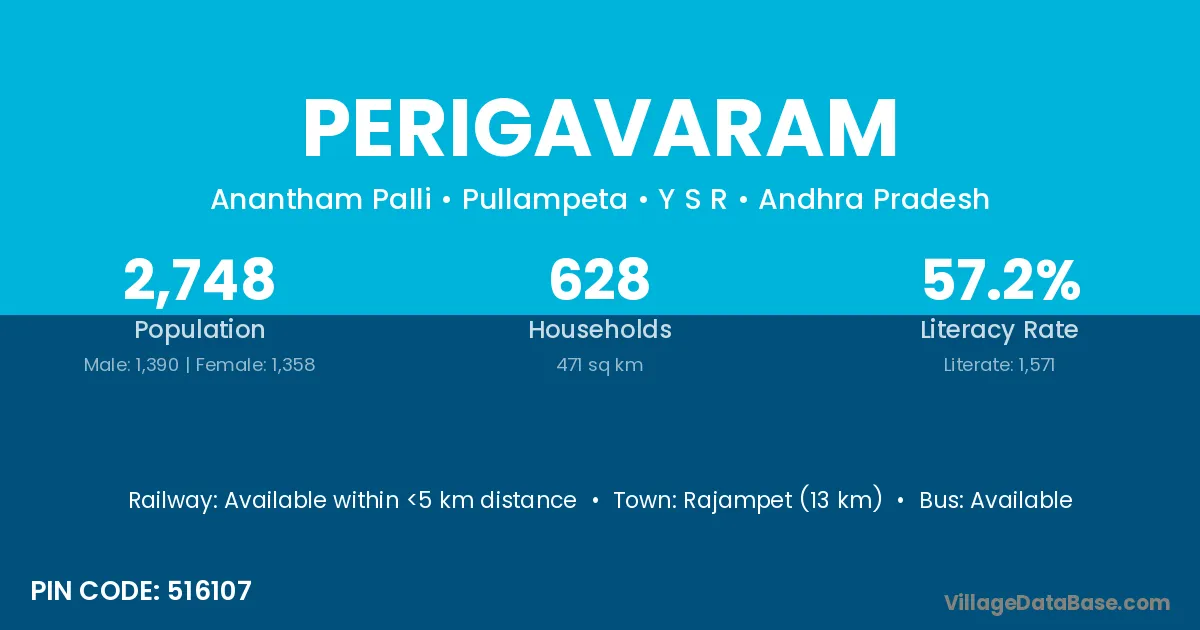 Rajampet (13 km) is the nearest town to Perigavaram village for major economic activities and is located approximately 13 km away.