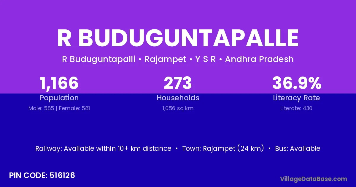 Rajampet (24 km) is the nearest town to R Buduguntapalle village for major economic activities and is located approximately 24 km away.
